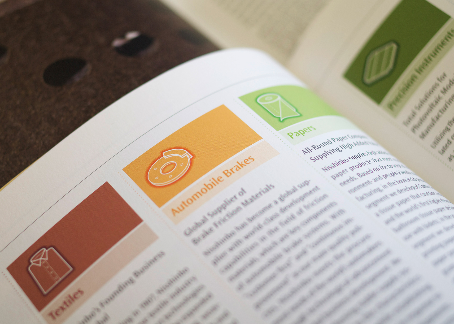 Nisshinbo Holdings prides itself on being an environmentally conscious company. For their 2010 Annual Report we helped them communicate their commitment to the environment through a narrative called “Green Story.” Along with high quality photography, Green Story showcased products from Nisshinbo’s six main business lines that contribute to reducing carbon emissions. This narrative offered an accessible way of explaining to readers what each business specializes in and how the company is working towards creating a low-carbon society.